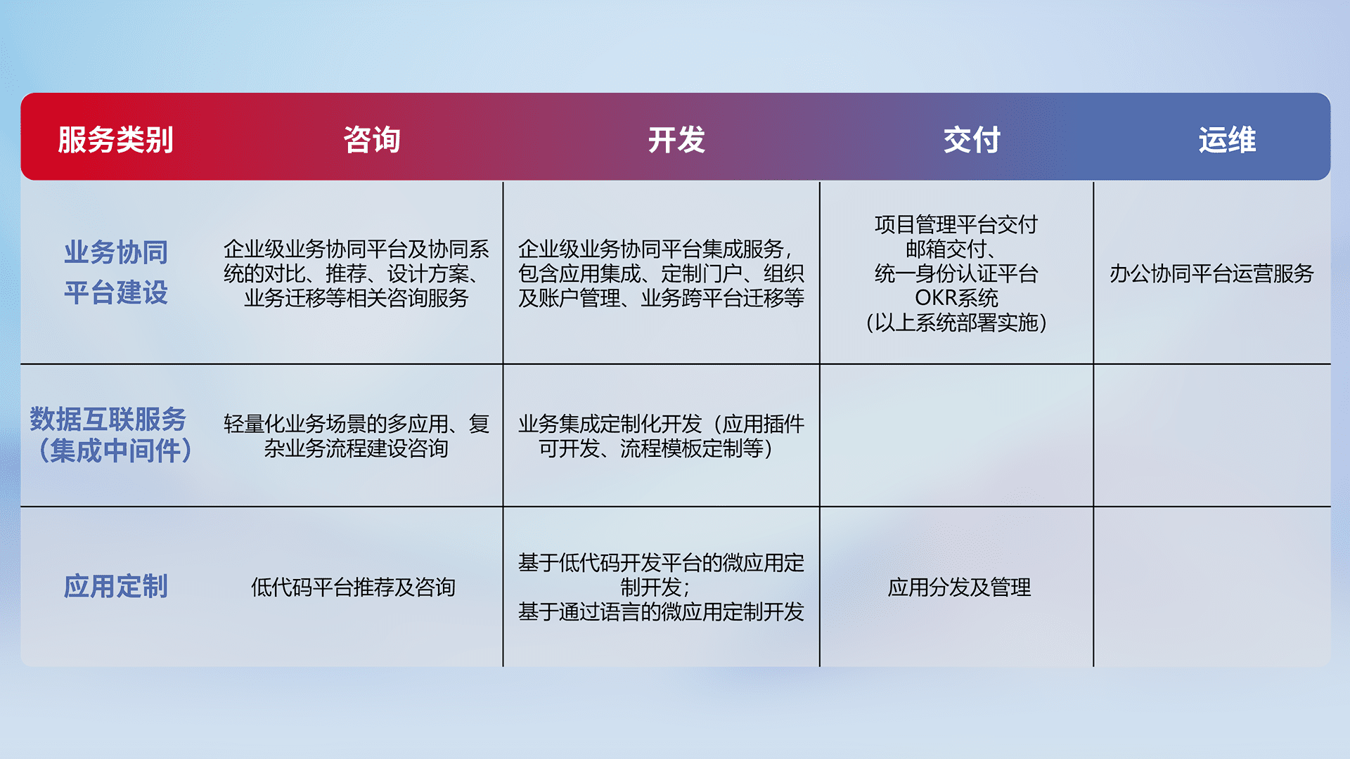 针对钉钉、、企微、、、IDaas等平台级产品提供产品的规划、、、方案、、交付、、、、定制化开发等服务,,,实现如统一协同办公、、智能客户服务、、、、混合会议管理、、、智能数据查询、、、等业务场景,,实现数字化转型。。。。